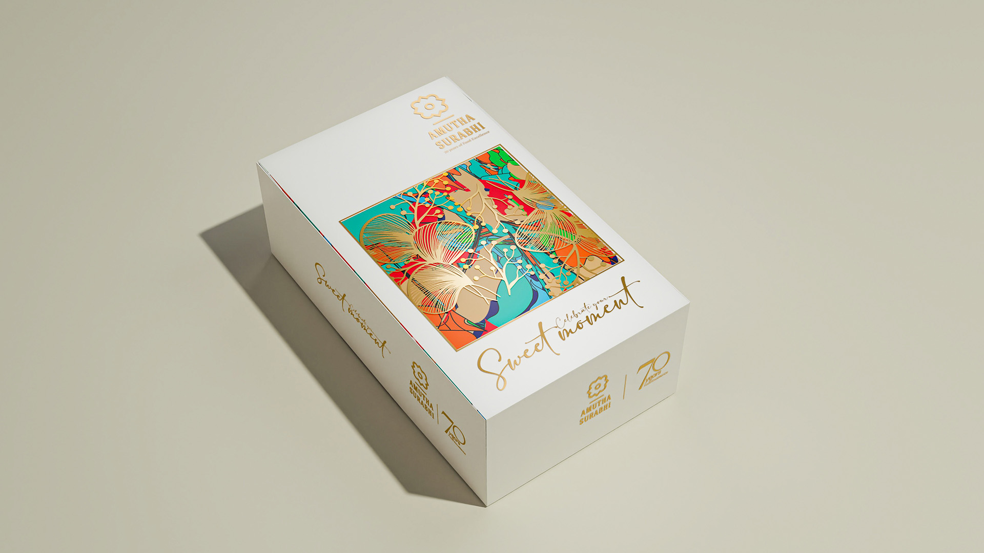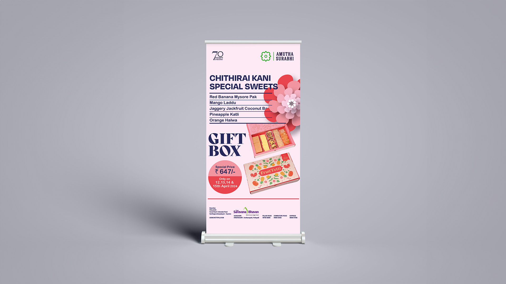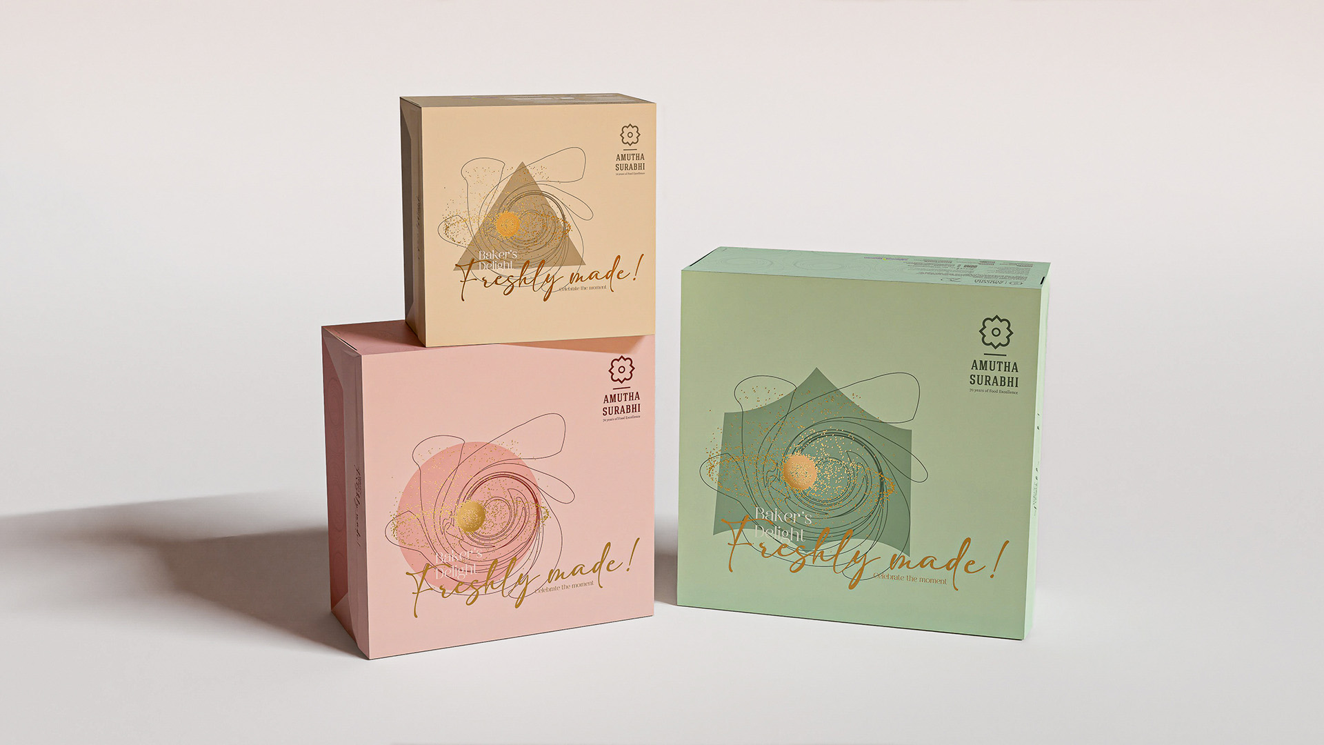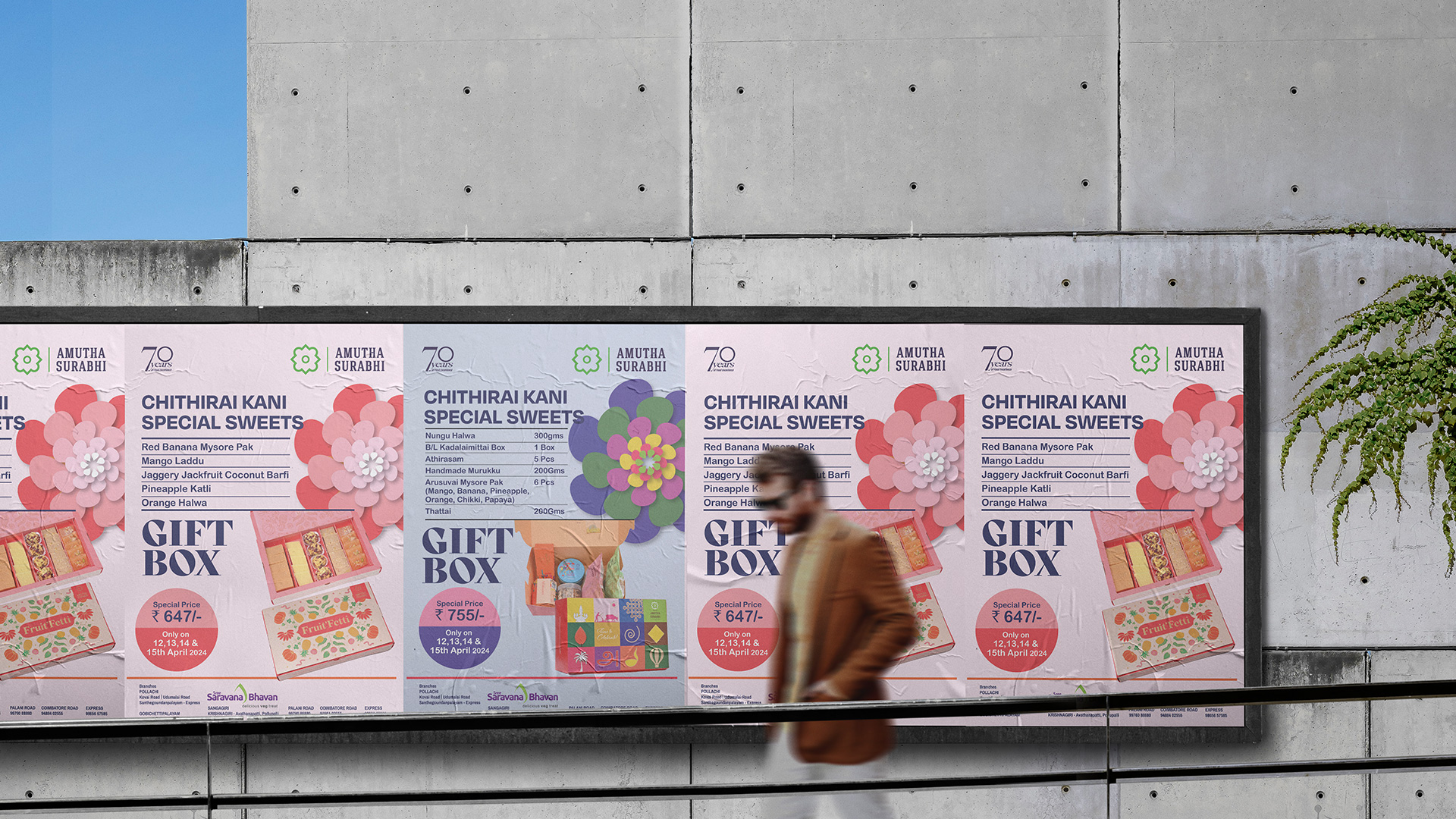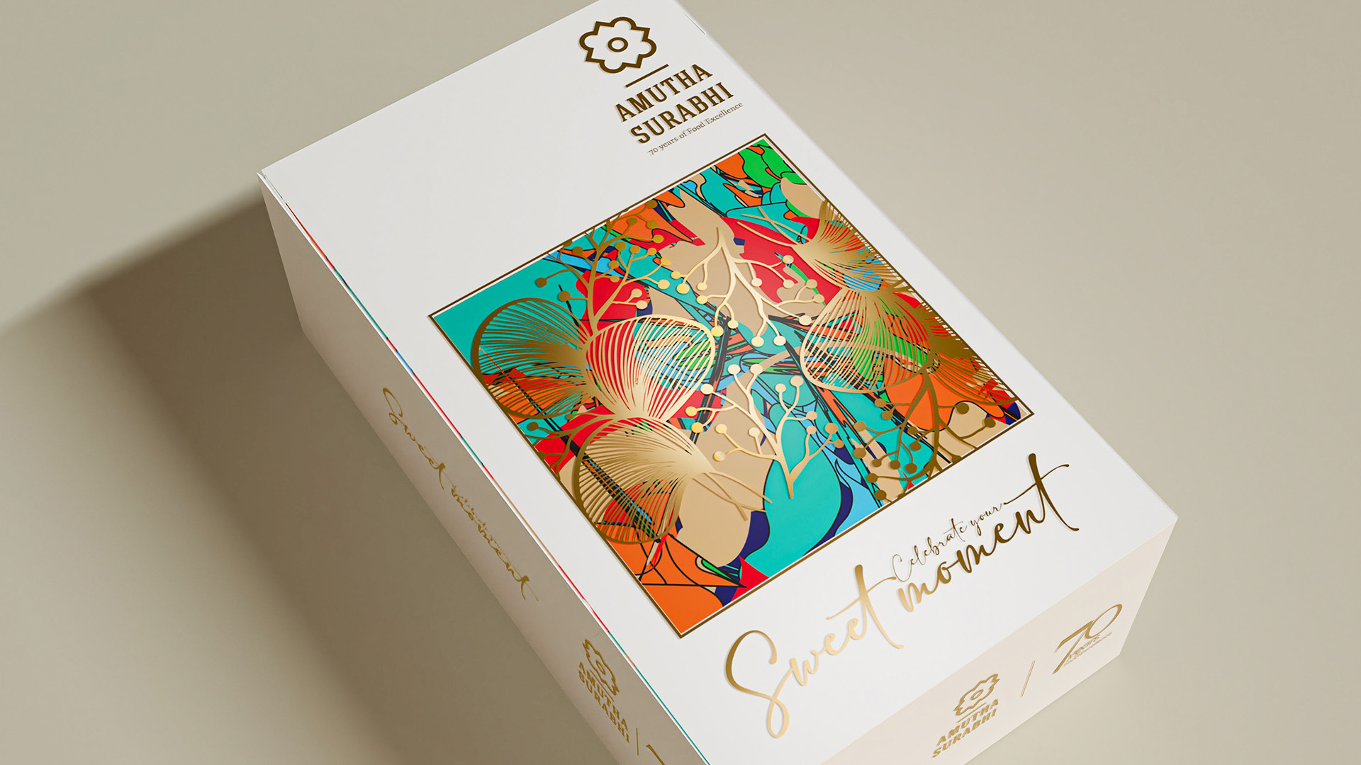 Signatures1 partnered with Amutha Surabhi to strategically shape and elevate every facet of its brand identity. From crafting a minimalist yet culturally resonant logo to designing a full suite of sweet boxes, festive packaging, and vibrant in-store collaterals, our approach was rooted in blending timeless tradition with international flair. Each element-from Diwali posters to Chithirai-themed standees, cake tins to pastel-hued gift boxes-reflected festive vibrance and design sophistication, ensuring the brand stood out across both physical shelves and digital displays.